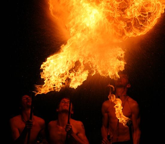 | Josh Case dances with a triple headed fire staff. LOTS of fire! |